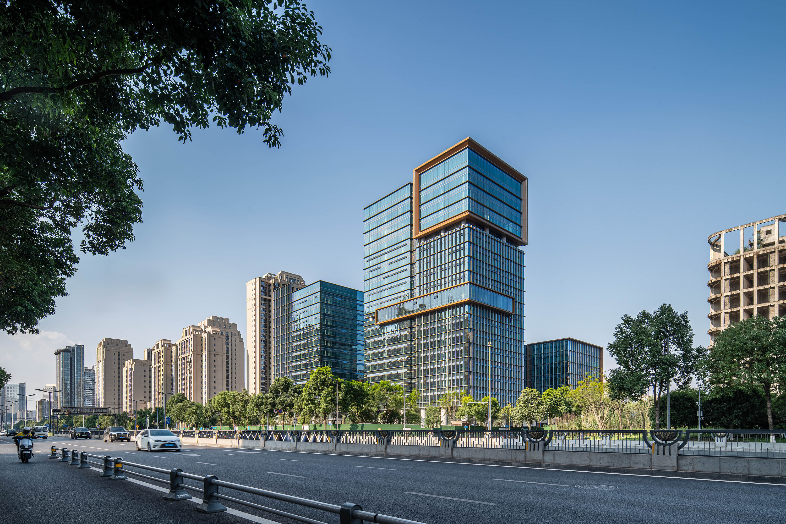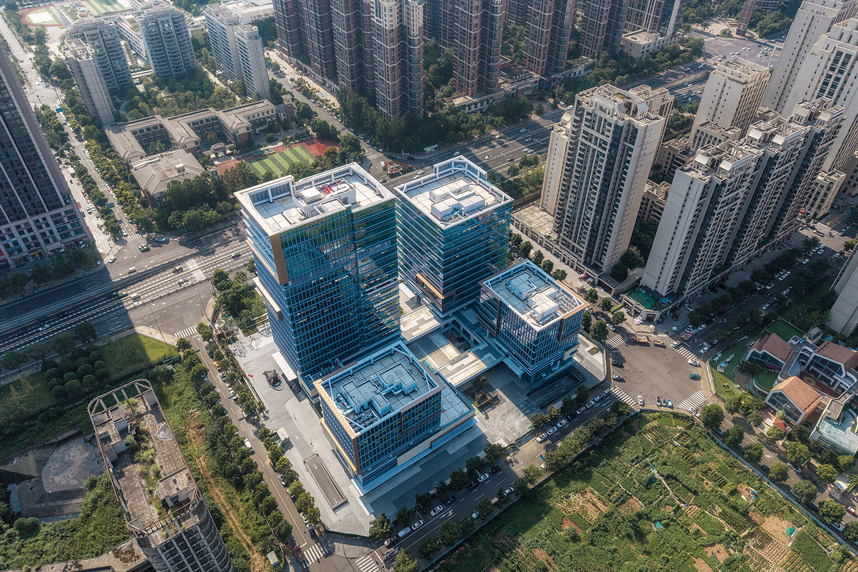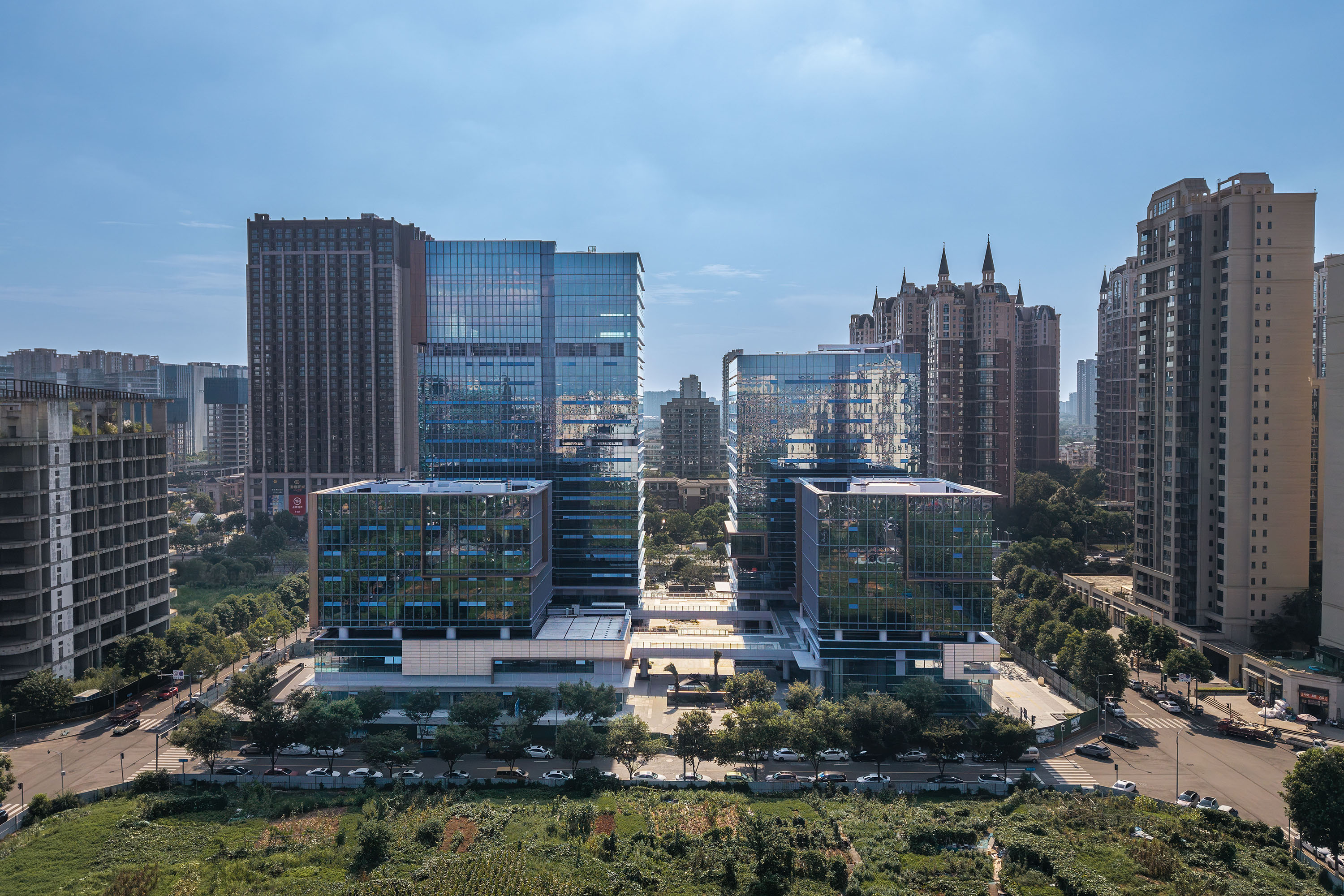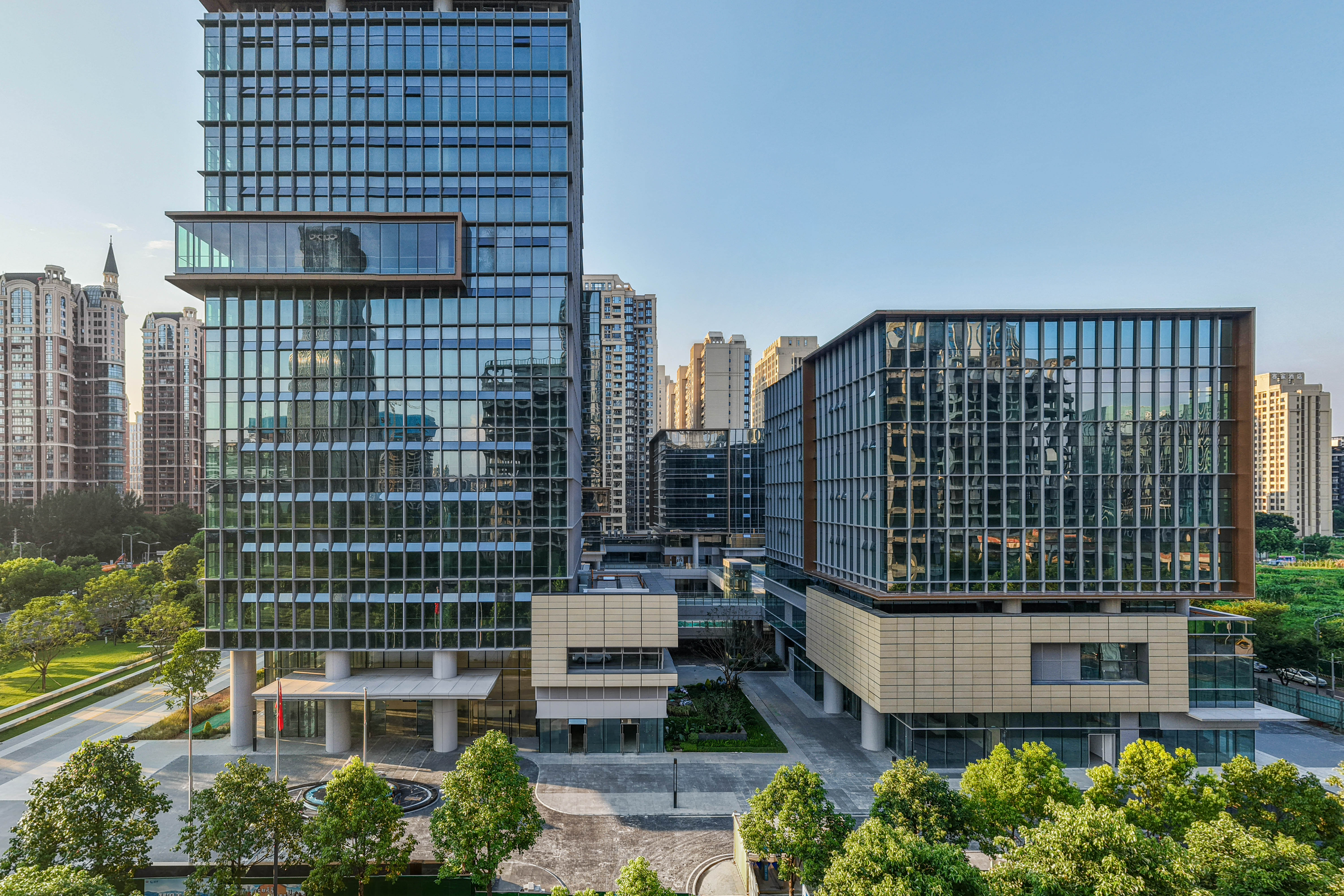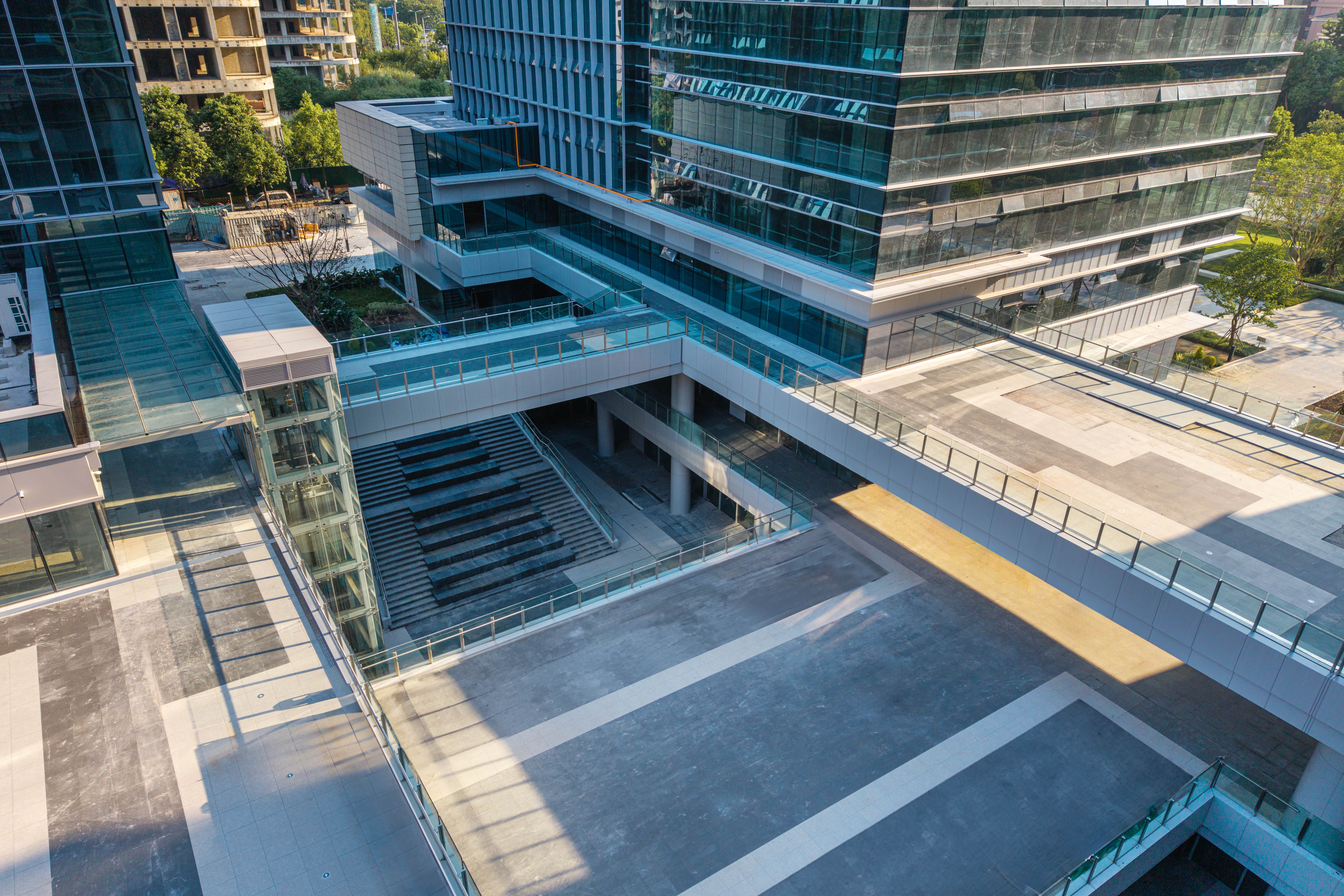 项目主要包括四栋办公楼、裙房及中间围合而成的广场。高低错落的两栋塔楼临近西侧城市主干道,另外两栋低层办公楼位于项目东侧。四栋建筑形成错落有致的空间形态和连贯而丰富的城市天际线。标志性的裸眼3D屏幕位于项目最高办公楼的顶部,是宣传、引流的高新之窗。
