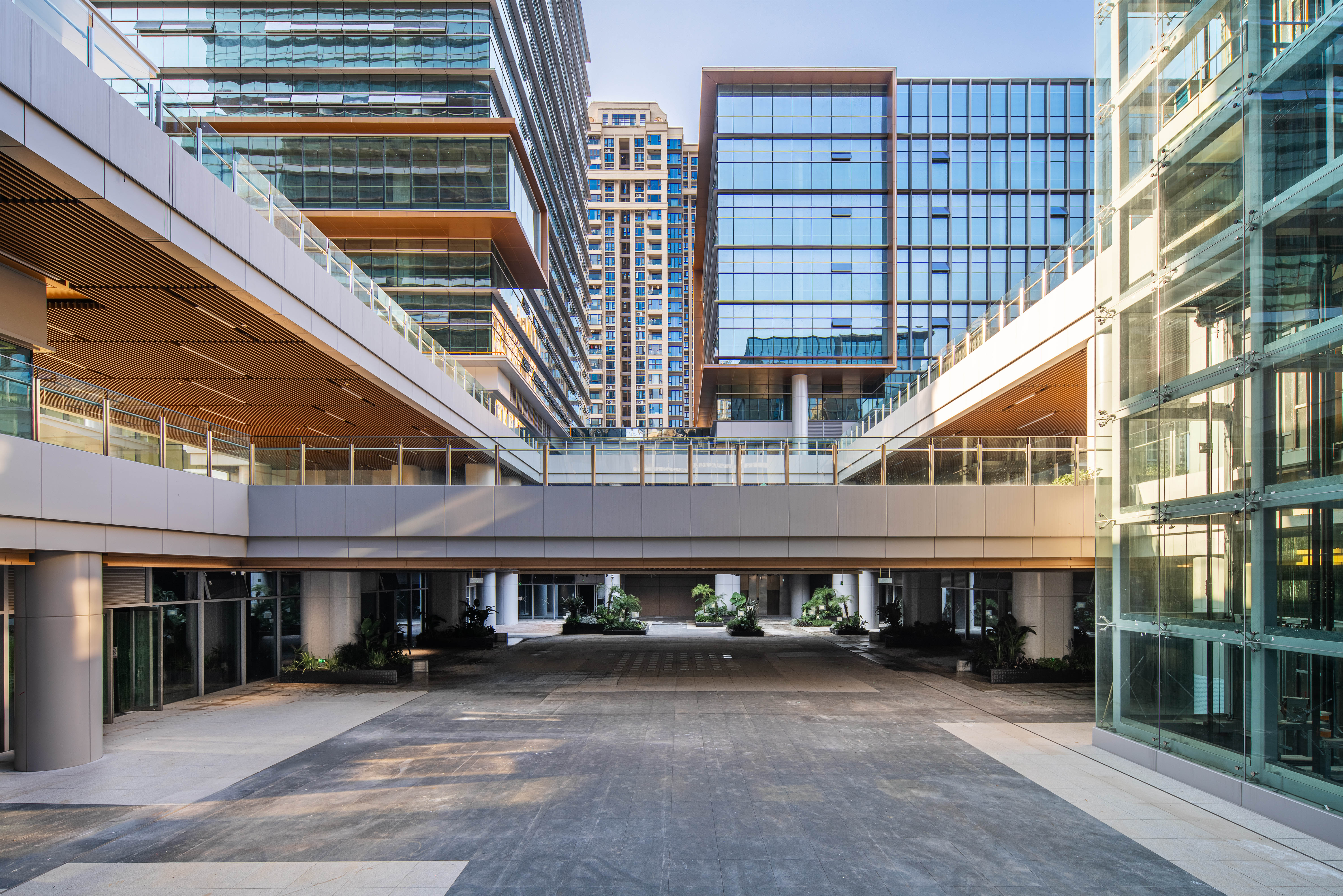 四栋办公塔楼围合,在基地内部形成了一个以立体的步行空间为主导的下沉式商业广场和城市花园,建筑内部如会议洽谈、发布会、艺术装置等多种功能与城市联系起来,多元化的业态承载着丰富的城市场景。