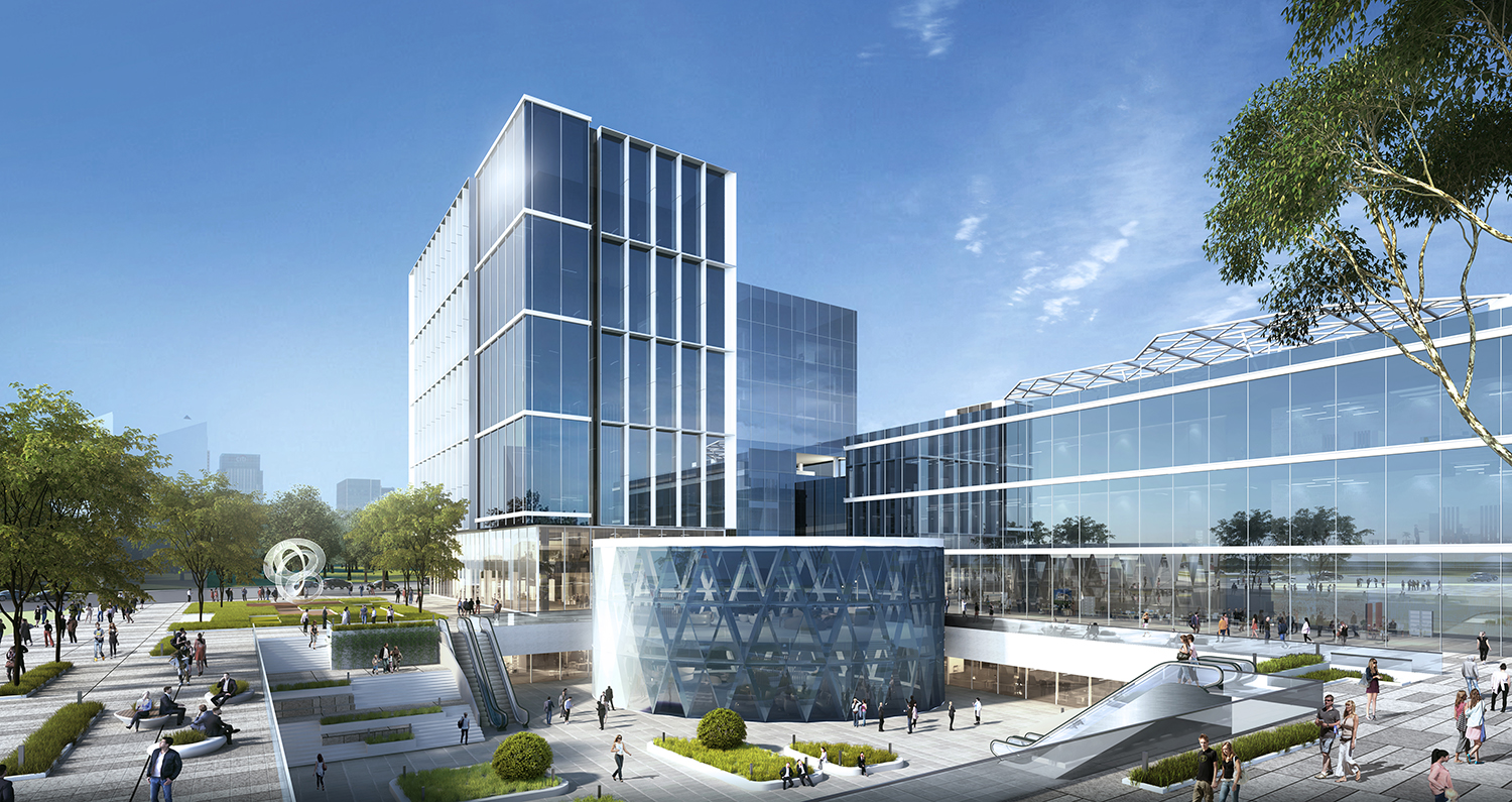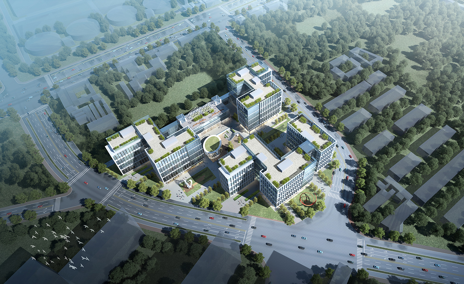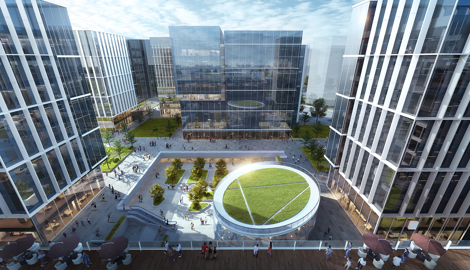 项目的创新之心下沉广场位于园区的中心位置,下沉广场的设置增加了地下建筑的使用率同时也美化了园区,为园区内工作的人员休闲娱乐、公共交流的活动场所。高品质创新办公楼平面采用“Z”字型布局,一层设置共享大厅,五层设置空中观景平台,满足了楼内工作人员的休憩需求,也使得立面变得活泼,不呆板。